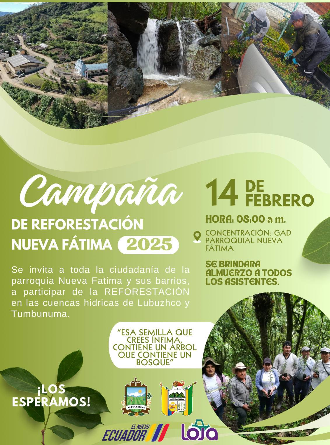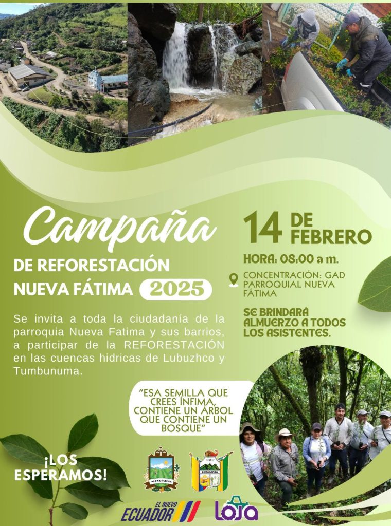 El Gobierno Parroquial de Nueva Fátima invita a la campaña de Reforestación este Viernes 14 de Febrero desde las 08h00 am, en los bajos de la institución, dónde será la concentración y posterior para reforestar nuestras cuencas hídricas de Tumbunuma y Lubhuzco con el Apoyo de Instituciones de Gobierno a nivel Cantonal, Jóvenes en acción y Ciudadanía en General.