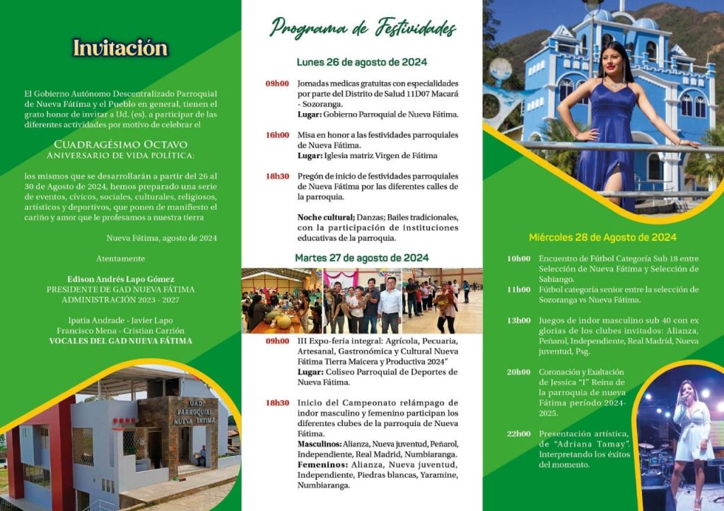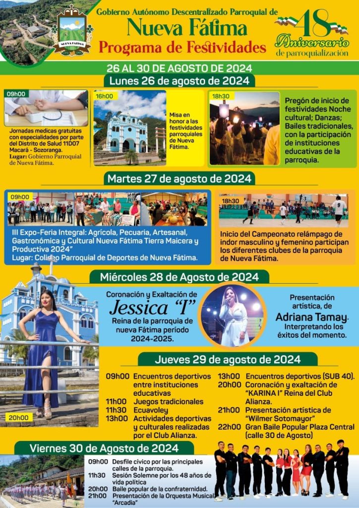 El Gobierno Autónomo Descentralizado de la Parroquia Nueva Fátima y su culta ciudadanía te invita a ser partícipe de nuestras Fiestas Parroquiales por conmemorar sus 48 años de vida Política