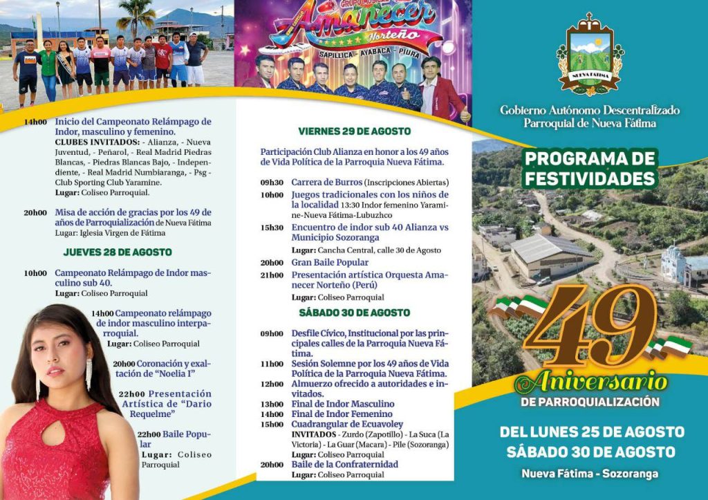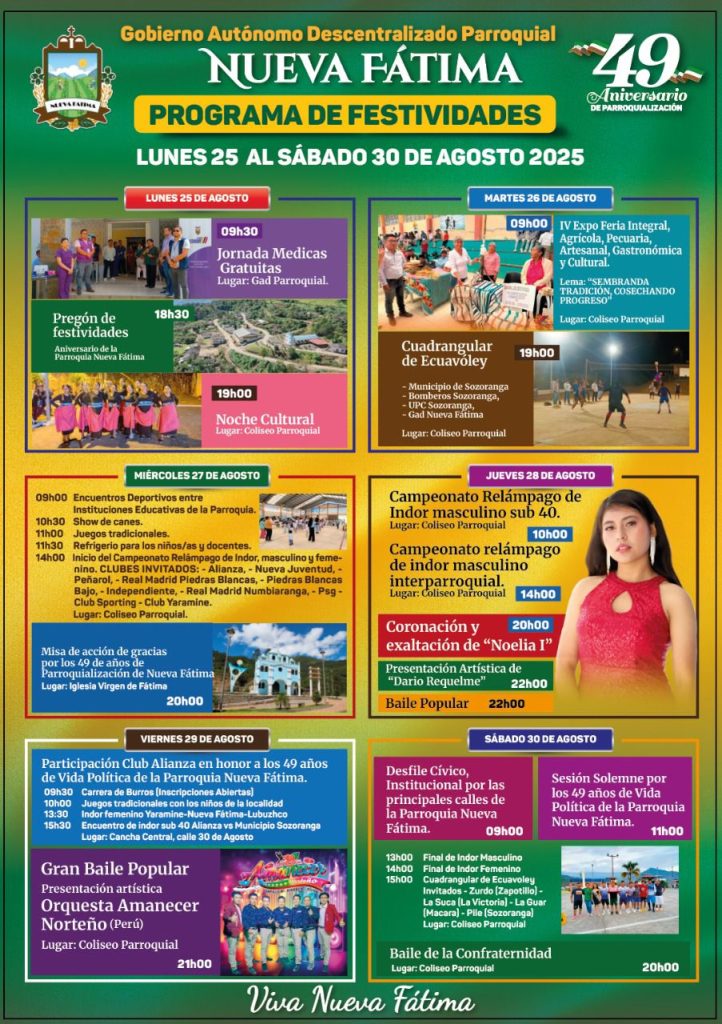 El GAD Parroquial de Nueva Fátima, Presidente, Vocales, Reina de la Parroquia y Ciudadanía en general, extienden la cordial invitación a propios y extraños a celebrar las Festividades de Parroquialización de Nueva Fátima, para ello hemos preparado una programación variada para el deleite de todos ustedes.