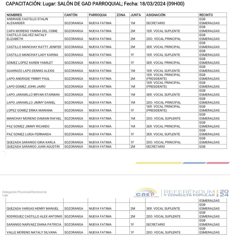 En uso de las facultades que confiere la Ley Orgánica Electoral y de Organizaciones Políticas de la República del Ecuador, Código de la Democracia, el Consejo Nacional Electoral, Delegación Provincial Electoral de Loja y la Junta Provincial Electoral de Loja, NOTIFICA a las ciudadanas y ciudadanos que a continuación se detalla, que han sido designadas y designados como Miembros de las Juntas Receptoras del Voto para el Referéndum y Consulta Popular 2024, del domingo 21 de abril de 2024, en amparo a lo establecido en el Art. 44.