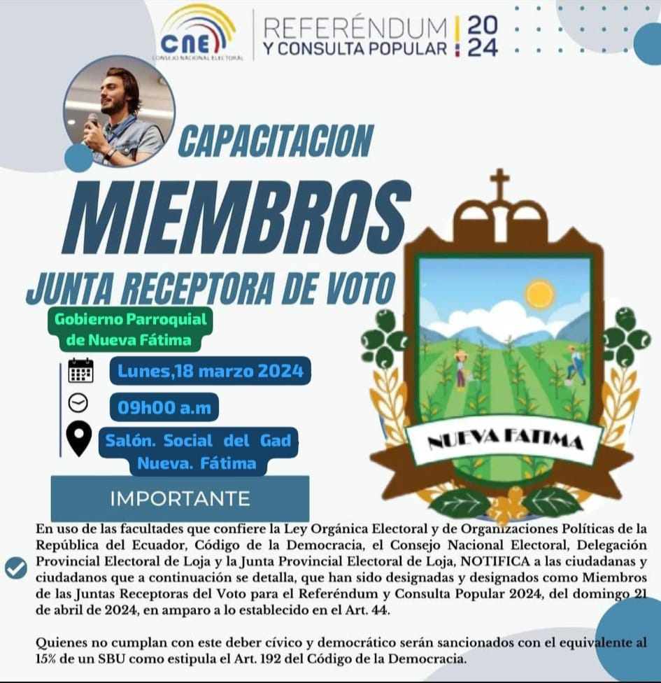 En uso de las facultades que confiere la Ley Orgánica Electoral y de Organizaciones Políticas de la República del Ecuador, Código de la Democracia, el Consejo Nacional Electoral, Delegación Provincial Electoral de Loja y la Junta Provincial Electoral de Loja, NOTIFICA a las ciudadanas y ciudadanos que a continuación se detalla, que han sido designadas y designados como Miembros de las Juntas Receptoras del Voto para el Referéndum y Consulta Popular 2024, del domingo 21 de abril de 2024, en amparo a lo establecido en el Art. 44.