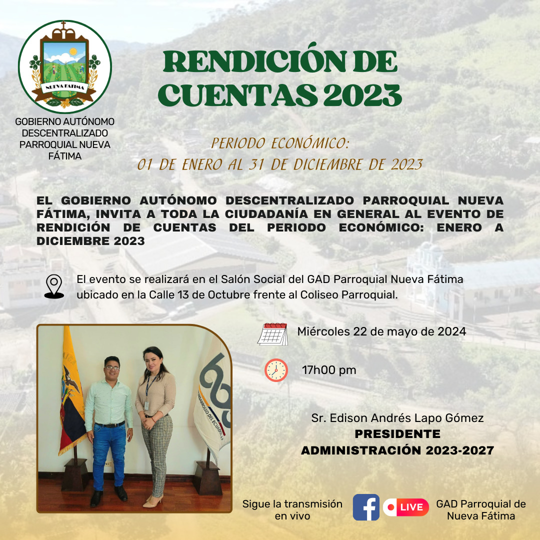 En cumplimiento y conforme lo dispone la Ley Orgánica de Participación Ciudadana y Control Social, EL Gobierno Parroquial procederá a la “RENDICIÓN DE CUENTAS” correspondiente al periodo 1 enero – 31 diciembre 2024.
